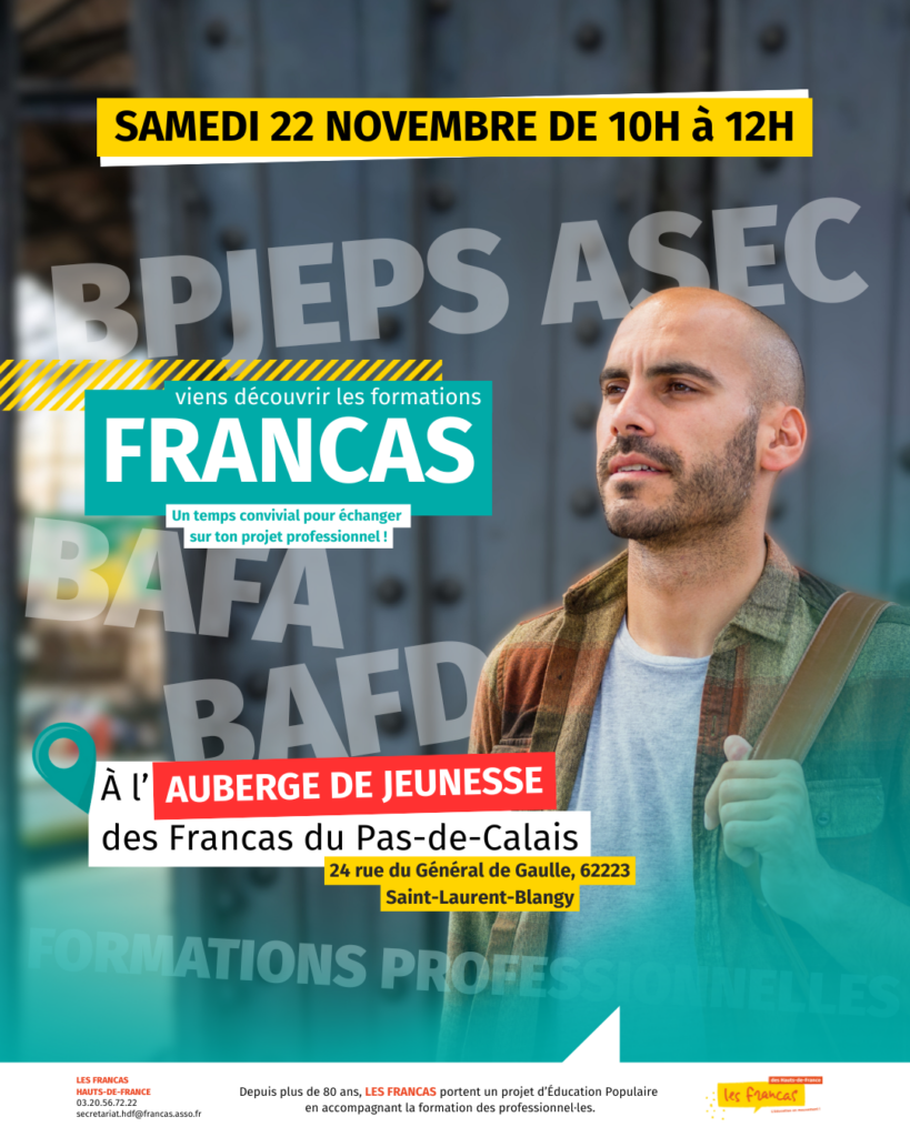 Le 22 novembre, de 10h à 12h 📍 Auberge de Jeunesse du Grand Arras – Les Francas au 24 rue du Général de Gaulle à Saint-Laurent-Blangy (ARRAS) 👉 Vous souhaitez évoluer dans l’animation, valoriser votre expérience ou construire un véritable projet professionnel dans le domaine de l’éducation et de l’engagement ? 📣 Les Francas vous […]